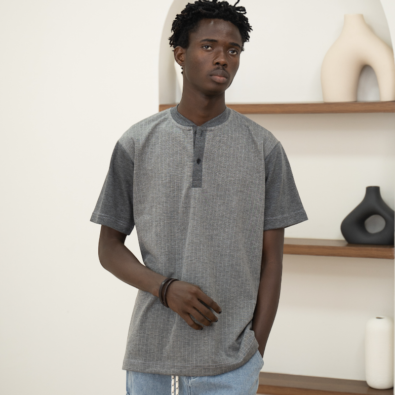 Grey Short Sleeve Henley with Grey Stripes
